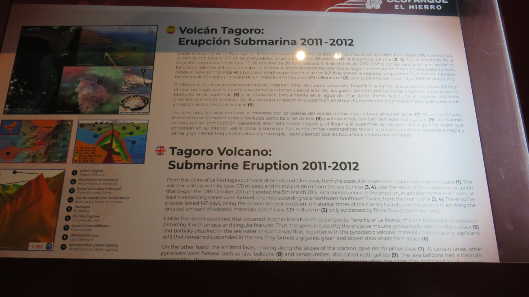 Das Informationszentrum zum Geopark liegt nur wenige Kilometer von La Restinga an der HI-4. Hier gibt es viele Informationen über den Vulkanismus, hauptsächlich zum Ausbruch des Unterwasservulkans vor La Restinga 2011/2012. Damals geriet das kleine Fischerdorf in den Fokus der Öffentlichkeit, als nur wenige Kilometer vor dem Ort unter Wasser ein Vulkan ausbrach und die Einwohner evakuiert werden mussten. Damals stoppte der Ausbruch weniger als  hundert Meter unter der Wasseroberfläche. Vielleicht entsteht hier irgendwann eine neues Insel oder El Hierro wächst weiter.