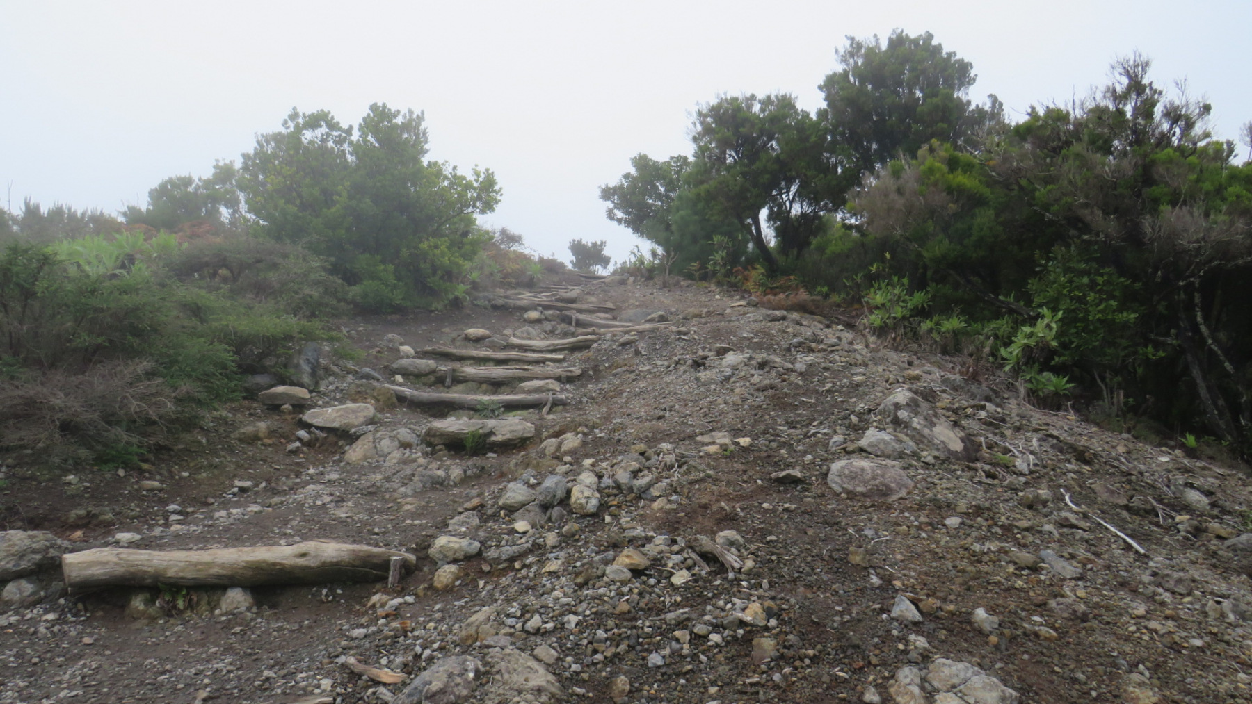 Der Rückweg gestaltete sich weitaus einfacher. Die Route 17 führt anfangs eine mit Steinen gepflasterten Straße hinab, von der sie dann abzweigt und als ein Weg ähnlich einer Schotterpiste weiter langsam bergab führt. Bei gutem Wetter hat man hier sicher eine wunderbare Aussicht. Bei uns wehte der Wind allerdings sehr heftig und die Passatwolken versperrten uns die Sicht auf die Landschaft. Allerdings ist der Weg doch sehr angenehm zu laufen und man läuft kaum Gefahr, sich hier irgendwie zu verletzen. Nach insgesamt 4,6 km kamen wir wieder am Parkplatz an und fuhren nach Hause.