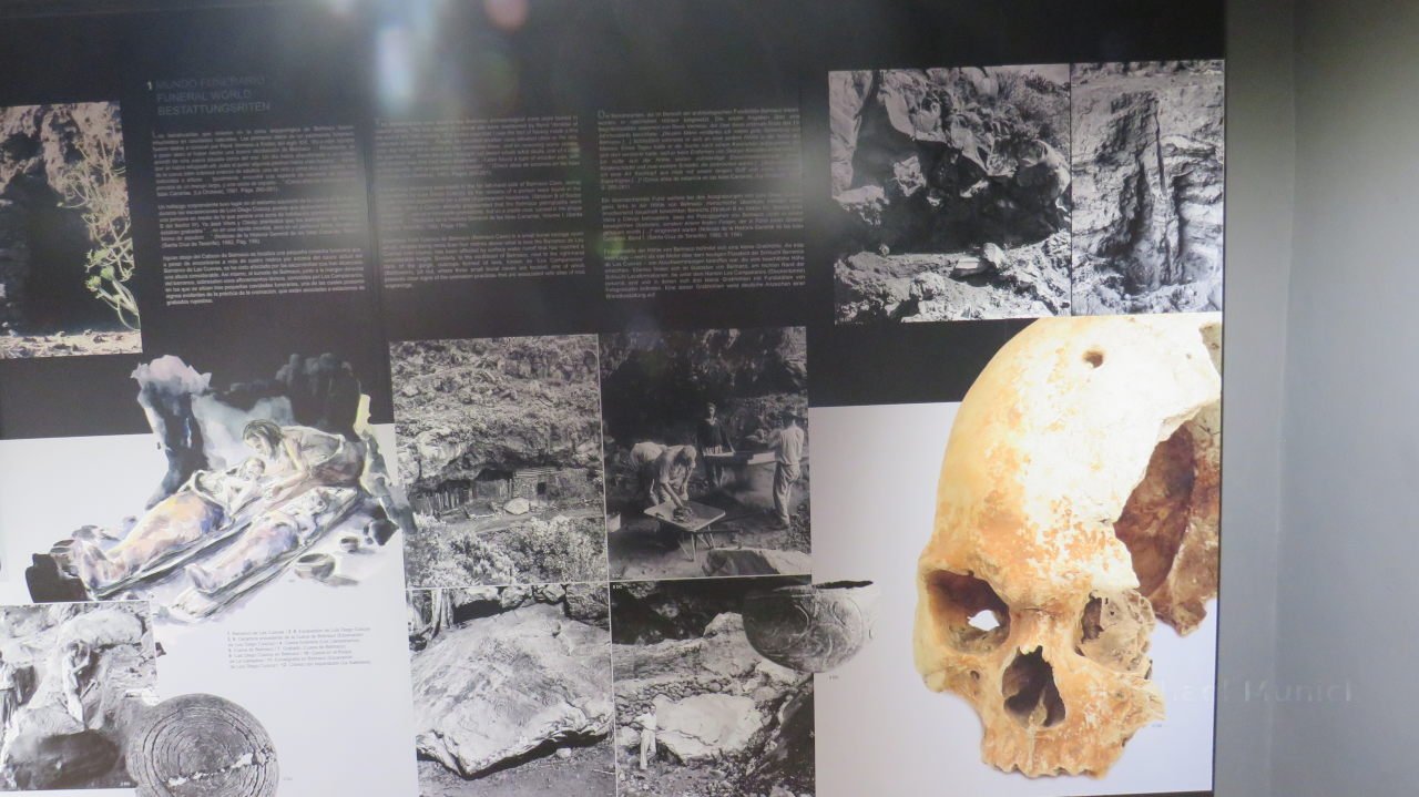 Nachdem der Eintritt bezahlt wurde, geht nach einmal hinab und zuerst zu der Ausstellung, welche sich über zwei Etagen erstreckt. Hier findet man Informationen zu den Ausgrabungen und Ausstellungsstücke von archäologischen Funden, welche hier ausgegraben wurden. Die Schautafeln mit den Erläuterungen sind sowohl in spanischer, englischer und deutscher Sprache verfasst. Man erfährt hier vieles über die Ureinwohner und ihre Lebensweise auf der vulkanischen Insel, die es ihnen nicht immer leicht machte. Leider sind viele Fotos nicht besonders gut geworden, da die Glasvitrinen doch sehr das Licht gespiegelt haben. Eine Auswahl davon ist in der Galerie am Ende der Seite.