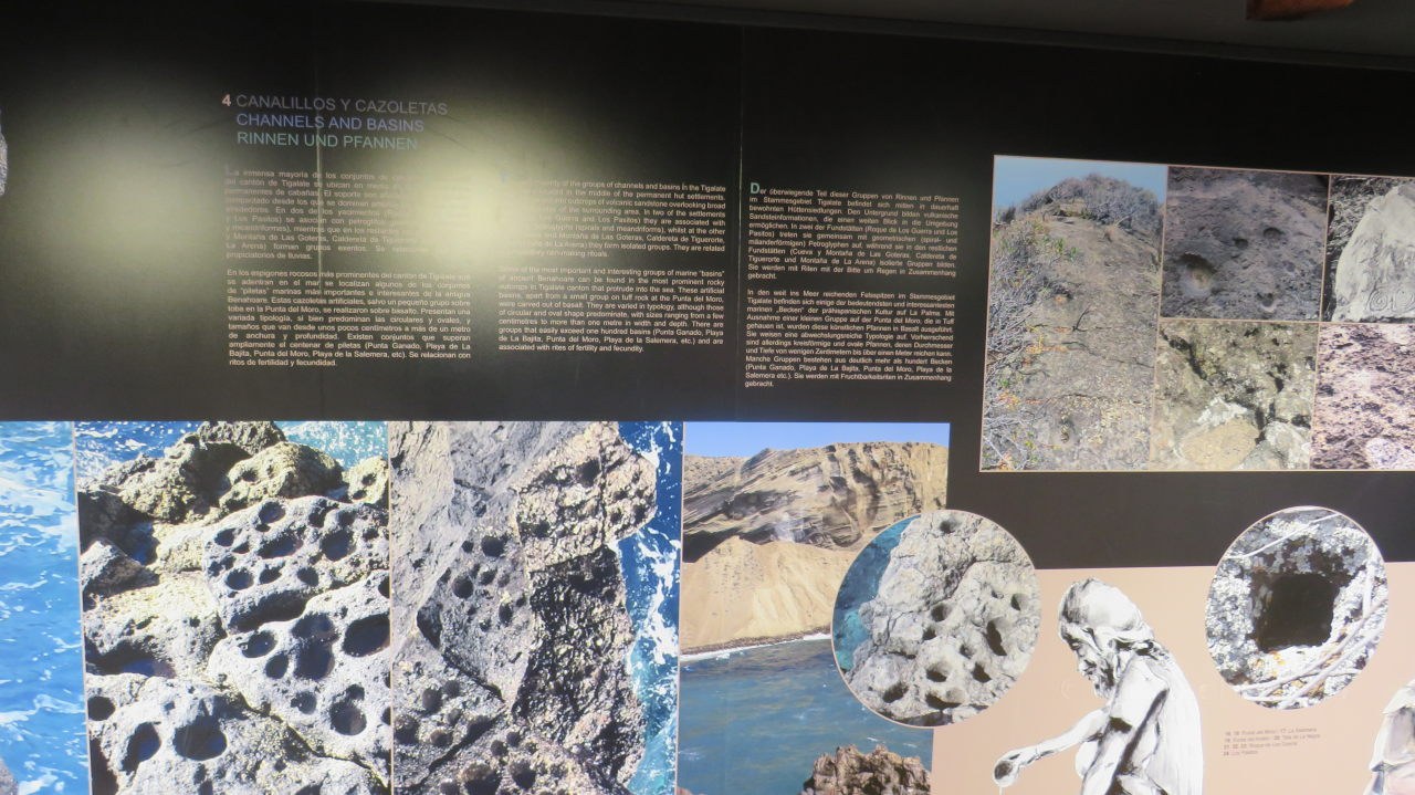 Nachdem der Eintritt bezahlt wurde, geht nach einmal hinab und zuerst zu der Ausstellung, welche sich über zwei Etagen erstreckt. Hier findet man Informationen zu den Ausgrabungen und Ausstellungsstücke von archäologischen Funden, welche hier ausgegraben wurden. Die Schautafeln mit den Erläuterungen sind sowohl in spanischer, englischer und deutscher Sprache verfasst. Man erfährt hier vieles über die Ureinwohner und ihre Lebensweise auf der vulkanischen Insel, die es ihnen nicht immer leicht machte. Leider sind viele Fotos nicht besonders gut geworden, da die Glasvitrinen doch sehr das Licht gespiegelt haben. Eine Auswahl davon ist in der Galerie am Ende der Seite.