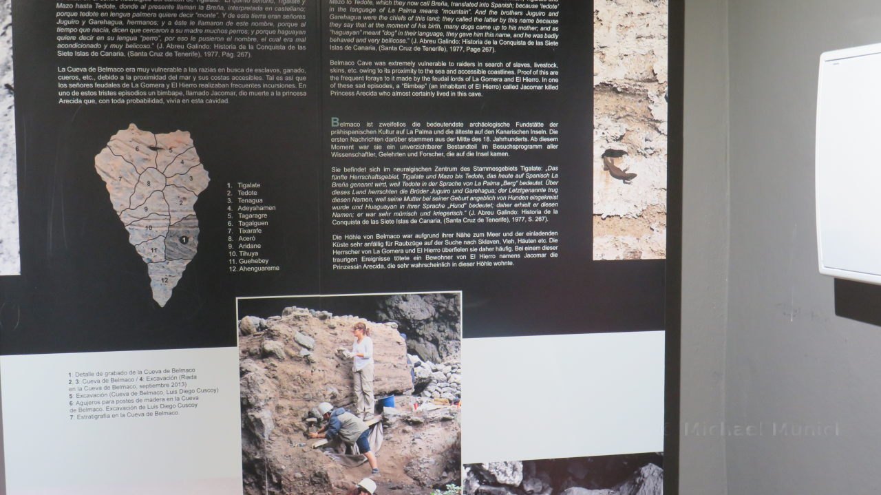 Nachdem der Eintritt bezahlt wurde, geht nach einmal hinab und zuerst zu der Ausstellung, welche sich über zwei Etagen erstreckt. Hier findet man Informationen zu den Ausgrabungen und Ausstellungsstücke von archäologischen Funden, welche hier ausgegraben wurden. Die Schautafeln mit den Erläuterungen sind sowohl in spanischer, englischer und deutscher Sprache verfasst. Man erfährt hier vieles über die Ureinwohner und ihre Lebensweise auf der vulkanischen Insel, die es ihnen nicht immer leicht machte. Leider sind viele Fotos nicht besonders gut geworden, da die Glasvitrinen doch sehr das Licht gespiegelt haben. Eine Auswahl davon ist in der Galerie am Ende der Seite.