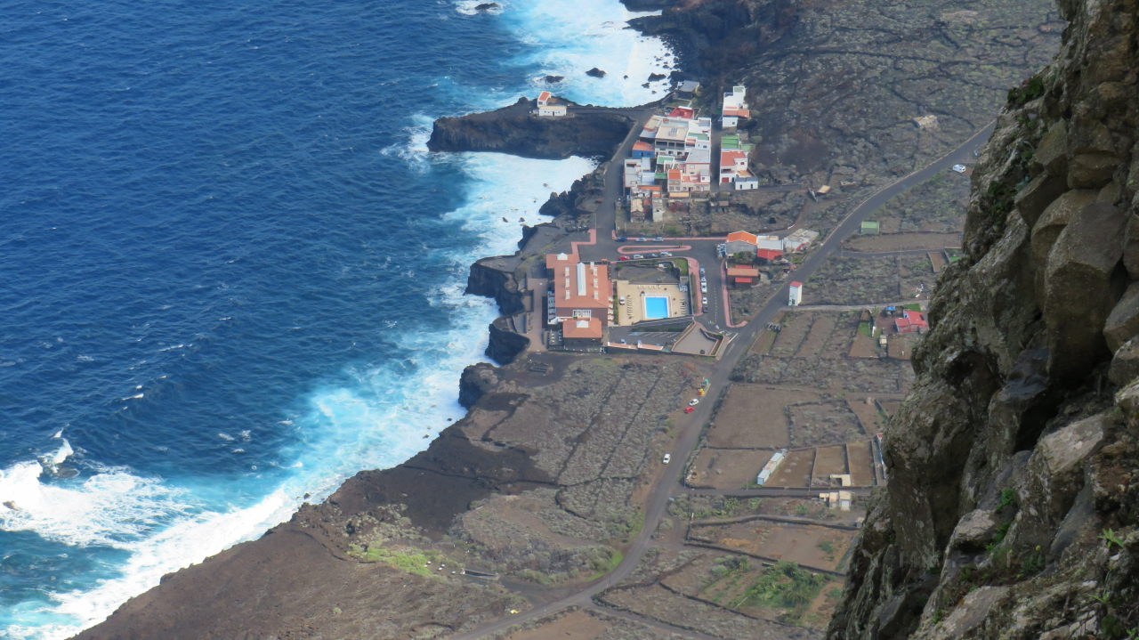 Die Wanderung führte uns über eine Schotterpiste etwa 3 km lan bis zu einer Gabelung des Weges. Nach rechts ging es zum Mirador de Bascos, nach links zu El Sabinar.  Wir gingen zuerst zum Mirador. Von der Gabelung war es noch etwa 1 km bis zum Mirador.  Dort angekommen mussten wir feststellen, dass dieser geschlossen bzw. gesperrt war. Bei genauerem hinsehen konnte man auch sehen, warum. Ein Teil des Miradors war abgebrochen, von daher war es zu unsicher. Trotzdem konnte man von hier oben einen schönen Blick über El Golfo erhaschen.  Auch unser Hotel konnten wir erblicken.