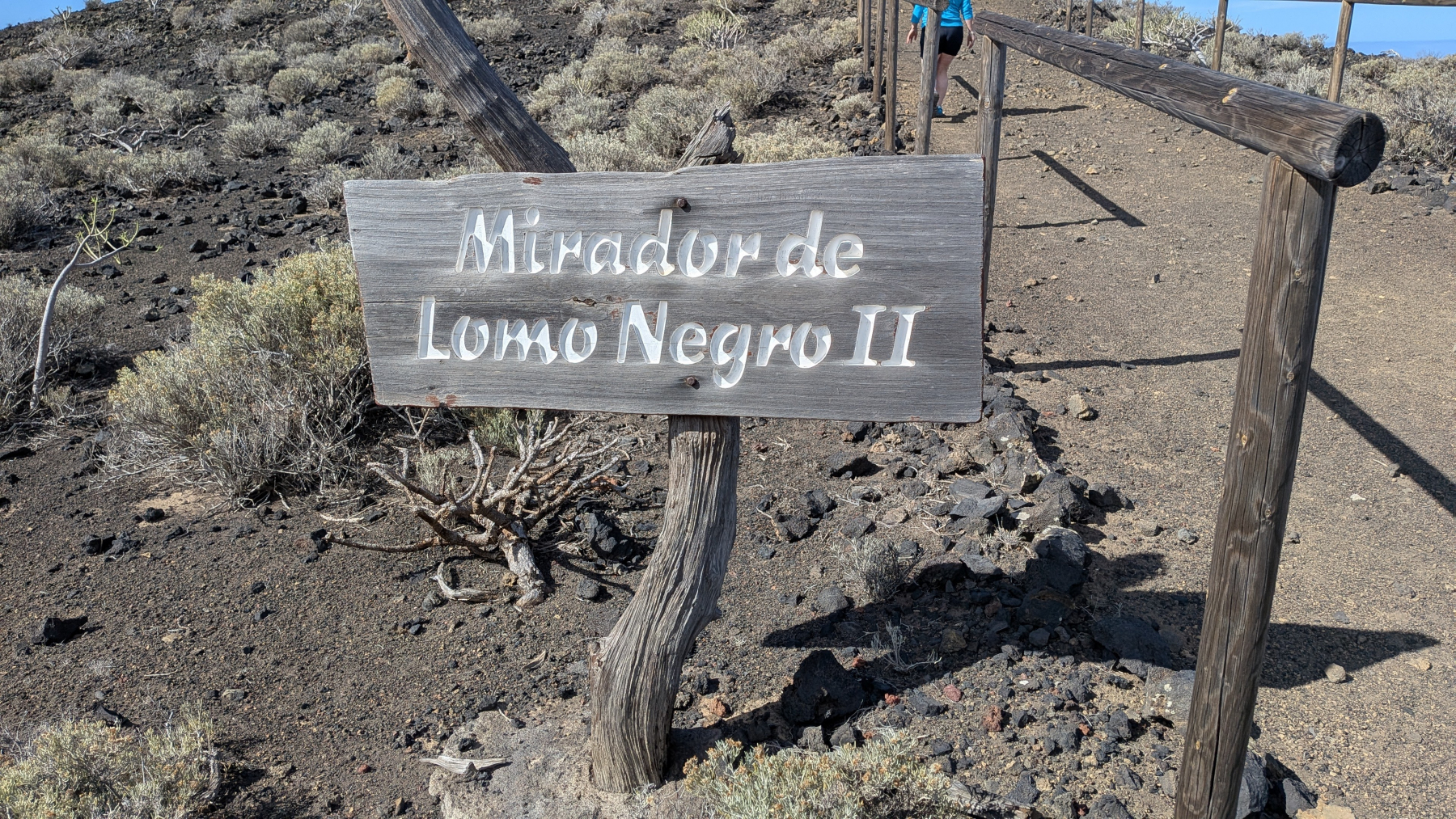 Die Wanderung führte uns über eine Schotterpiste etwa 3 km lan bis zu einer Gabelung des Weges. Nach rechts ging es zum Mirador de Bascos, nach links zu El Sabinar.  Wir gingen zuerst zum Mirador. Von der Gabelung war es noch etwa 1 km bis zum Mirador.  Dort angekommen mussten wir feststellen, dass dieser geschlossen bzw. gesperrt war. Bei genauerem hinsehen konnte man auch sehen, warum. Ein Teil des Miradors war abgebrochen, von daher war es zu unsicher. Trotzdem konnte man von hier oben einen schönen Blick über El Golfo erhaschen.  Auch unser Hotel konnten wir erblicken.